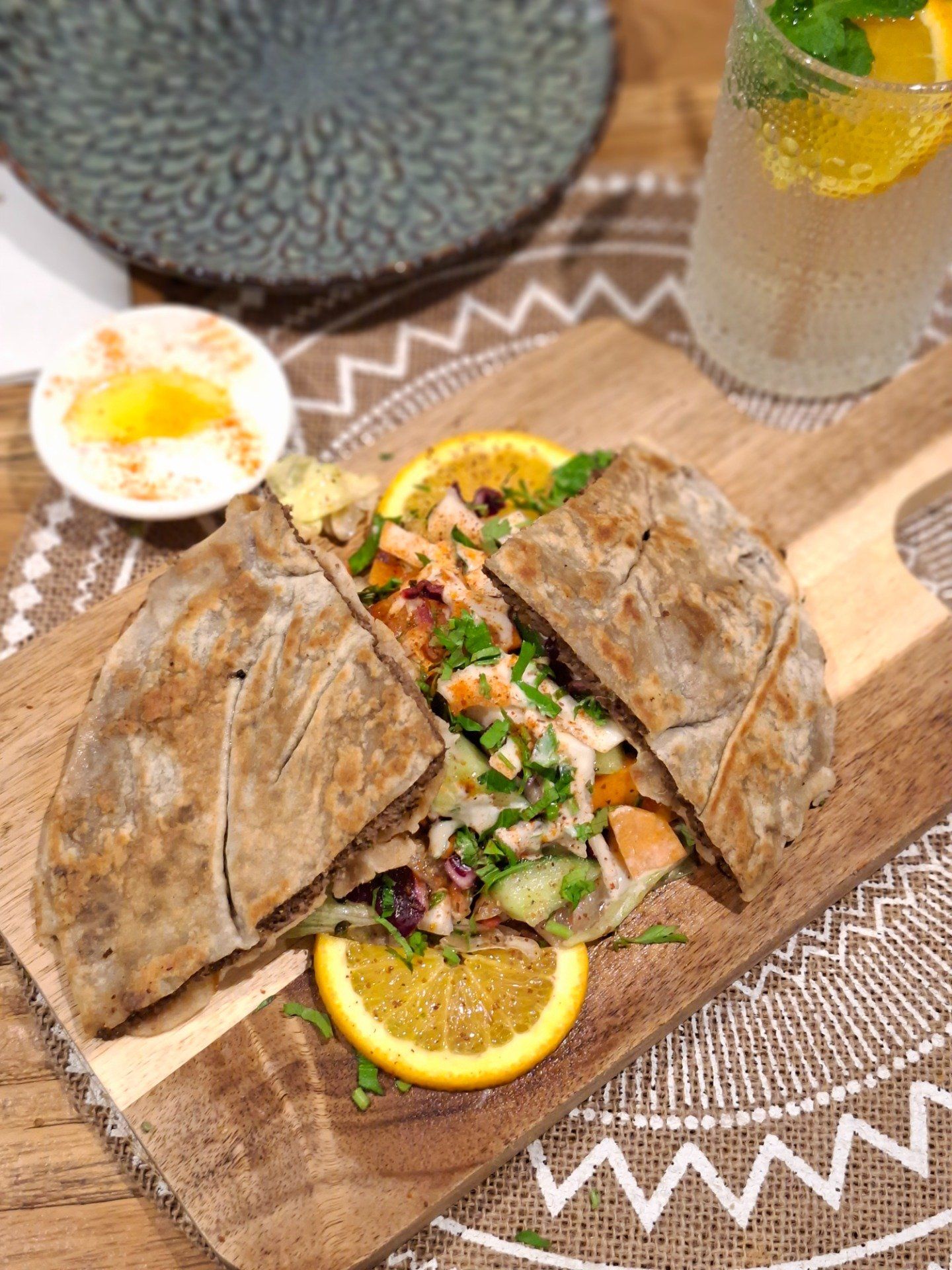 pain libanais farci à la viande hachée et grillé avec sa salade orientale